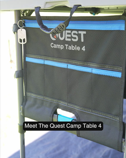 The Quest Camp Table 4 is a sturdy, lightweight and super practical camp kitchen companion. We teamed a sturdy steel frame, UV-protected tabletop, and superb storage options, and we had a winner. We added easy single-button height adjustment anyway - this is the handiest camping and outdoor table you can have in the country. Thanks to super-easy single-handed height adjustment, Camp Table 4 goes from low coffee table height through to 86cm preparation table height.When your kitchen is out in the great outdoors, you need easy access to your utensils, and we've got you covered with plenty of storage. Store pantry essentials and more in the under-table storage hammock and stick your utensils in the side storage organiser. Set up and pack down is a breeze - all the storage stays attached. The easy-to-clean UV-protected tabletop is built tough to prevent damage from the harsh Aussie sun and provide stable service for years to come. We're so confident about Camp Table 4 that we offer you a 2-year warranty against defects!Set your table to your height with the Quest Camp Table 4 - the ultimate addition to your gear.